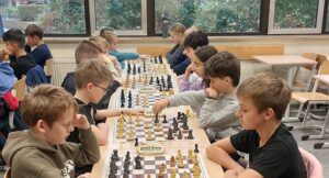 4. November nach Ende der 6. Stunde: Paula und Herr Flagge-Pätzold rücken in O11 Tische, bauen Bretter und Figuren auf, stellen Uhren daneben. Schülerinnen und Schüler unserer fünften, sechsten und siebten Klassen kommen dazu. Schließlich treffen die Delegationen des HG mit Herrn Boske und der IGS mit Herrn Dannehr ein. Verabredet sind wir zum traditionellen Drei-Schulen-Turnier, dem Auftakt der Wettkampfsaison im Schulschach.